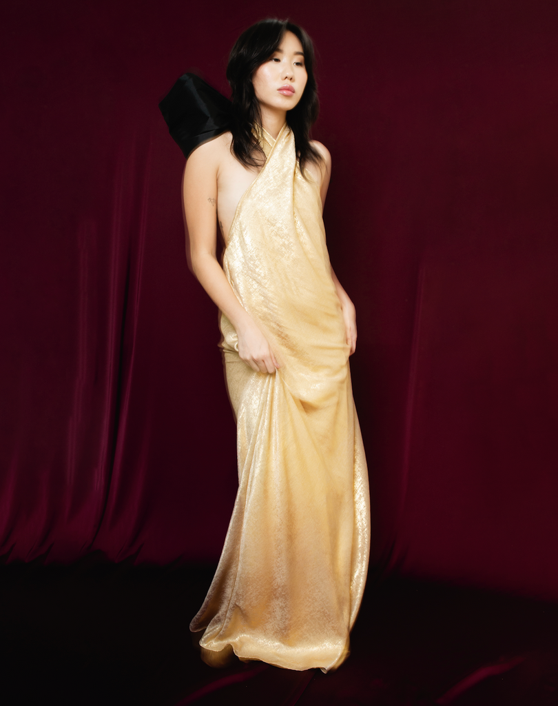 The Panchita Dress features a flowy, unstructured, low-back design accentuated by long taffeta straps that cross around the neck for a flattering halter-neck collar. The straps can be tied in a voluminous bow shape or be worn loose, according to the wearer's personal style.