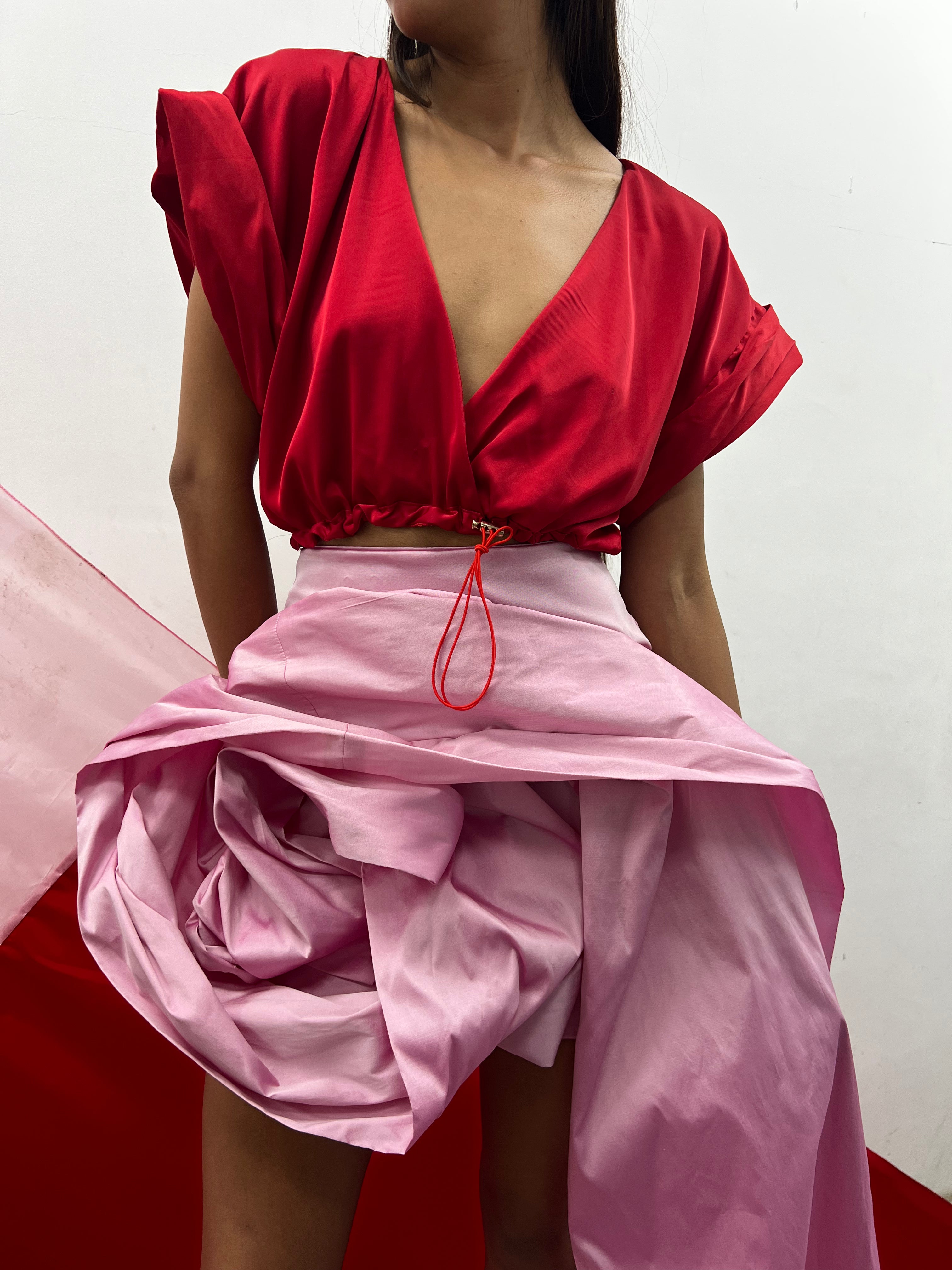 The Rosa mini skirt offers a voluminous, romantic take on a staple silhouette. Featuring a three-dimensional rose appliqué design across the front, the skirt flows dramatically towards the floor on one side with a delicate strap.